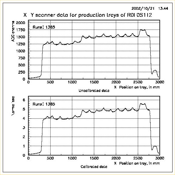 This utility may be used to plot data for single tray by entering its unique tray specification, for example R0L0S1T2. In this case, raw and calibrated data of that tray for the X-position along the source wire is plotted in a two-in-one-page format. Appropriate global title (tray specification) and legend (test run number) are choosen for the plots. A sample plot for this case is shown below: