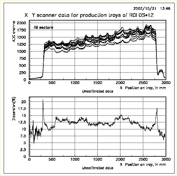 When a group of trays (typically all sectors in a tray) are specified, for example R0L0S*T2, two pages of two-in-one plots are output. On the first page, raw data of all the trays are superimposed in one plot and data dispersion of this group plotted in another. On the second page, similar plots are generated for the calibrated data of the same group. Dispersion is calculated as the ratio of diffence to the sum of maximum and minimum among all trays' data at that X-position. This dispersion data for the raw and calibrated data is stored as plain ASCII files so that it can be used later for obtaining global dispersion plots etc. Again appropriate global title (tray specification) and legend (sector numbers) are choosen for the plots. A sample plot for this case is shown below: